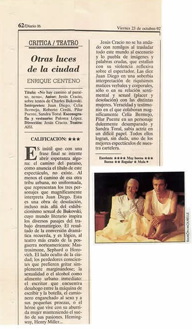 Sandra Toral, sabia actriz en un difícil papel. Enrique Centeno, crítica de “Otras luces de la ciudad” en Diario 16